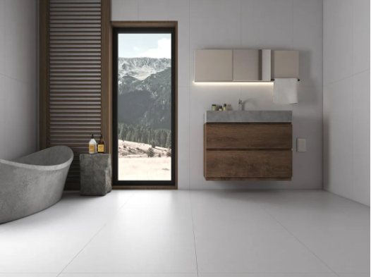 以簡單純粹的姿態(tài),洗去繁忙工作和喧囂日常帶來的疲憊感。750x1500mm西江月通鋪浴室,細(xì)沙干粒半拋帶來的天然質(zhì)感搭配原木色浴室柜,干凈配色與極簡設(shè)計,為空間打造與眾不同的寧靜時光。