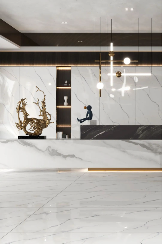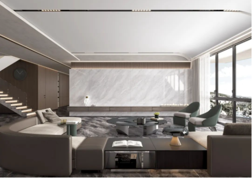 空間結(jié)合簡(jiǎn)約時(shí)尚的家具搭配,無(wú)限連紋的線條柔中帶剛,滲透出真實(shí)石材的自然韻律,飄然逸動(dòng)的紋理綿延,山巒疊嶂,橫看成林側(cè)成峰,以海納百川之胸懷盡顯磅礴氣勢(shì)。