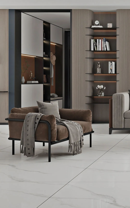 冰河白作為主調(diào)的空間,不禁讓人幻想起極其純凈的山河冰川。設(shè)計(jì)師帶著對(duì)自然風(fēng)光的憧憬,將行云流水般的石紋糅合在瓷磚的表面上,展現(xiàn)出如夢(mèng)似幻的地貌特色,帶來非凡體驗(yàn)。