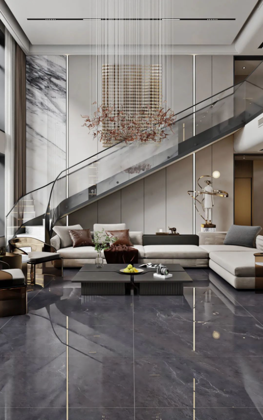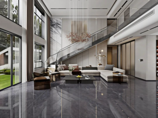 客廳采用挑高設(shè)計(jì),不僅能增強(qiáng)室內(nèi)采光效果,同時(shí)突出空間錯(cuò)落有致的層次感,讓客廳高級(jí)感瞬間拉滿,加上斯克深灰獨(dú)一無二的紋理,無論檔次、質(zhì)感、氣場(chǎng),都透露著別具一格的藝術(shù)氛圍。