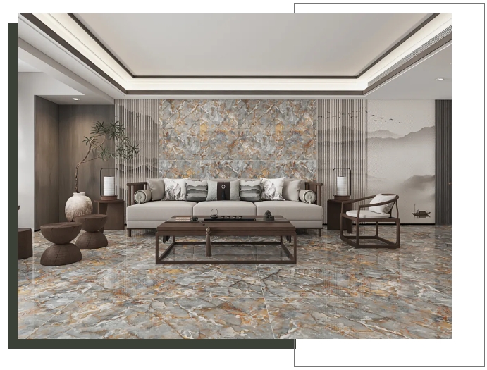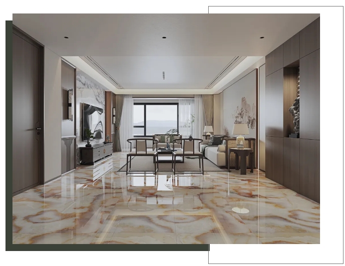 【瑪吉特】整體大面積上墻鋪地,打造出大氣磅礴的視覺(jué)張力,搭配新中式風(fēng)格的家居軟裝,將高級(jí)與優(yōu)雅平衡融入,盡顯居者不俗的審美品味。