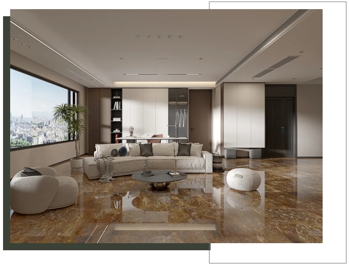 客廳選用【密爾沃】通鋪于地面,以灰色為客廳的主調(diào),恣意流淌的精致紋理,與窗外陽(yáng)光交織互動(dòng),呈現(xiàn)高級(jí)、沉穩(wěn)的雅致氛圍。